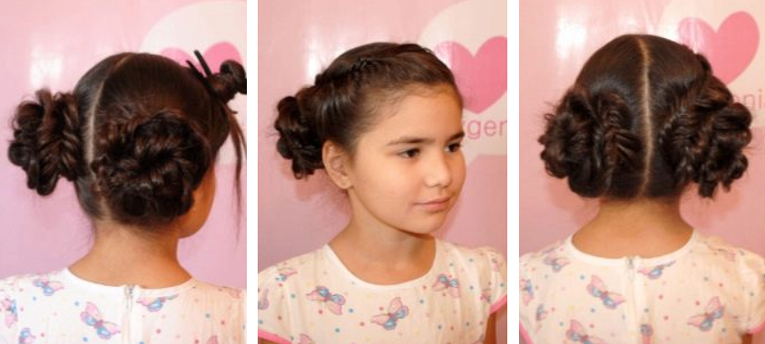 - Оставшиеся свободными кончики кос сбрызните лаком, накрутив на палец, подержите минутку в таком положении. При помощи невидимок сформируйте из получившихся завитков цветы. В результате прическа должна напоминать две симпатичные розочки.