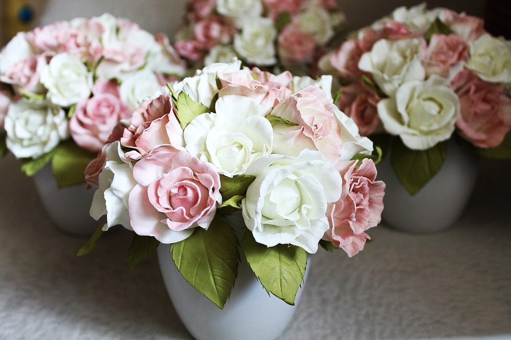 Искусственные соцветия белых роз с приклеенными зелеными листиками