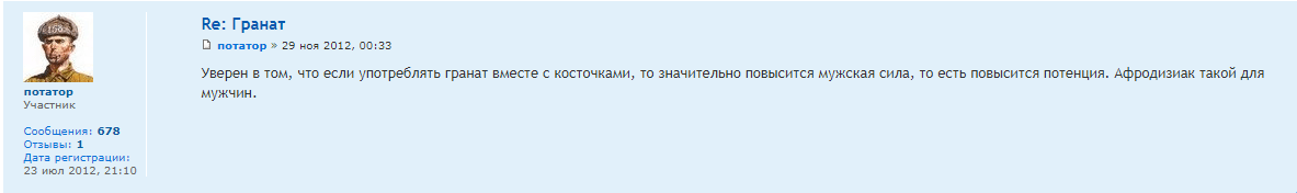 По отзывам на форумах гранат действительно помогает мужчинам улучшить потенцию, а также способствует повышению спортивных показателей. С сайта http://doctorsforum.ru/viewtopic.php?f=12&t=1240: