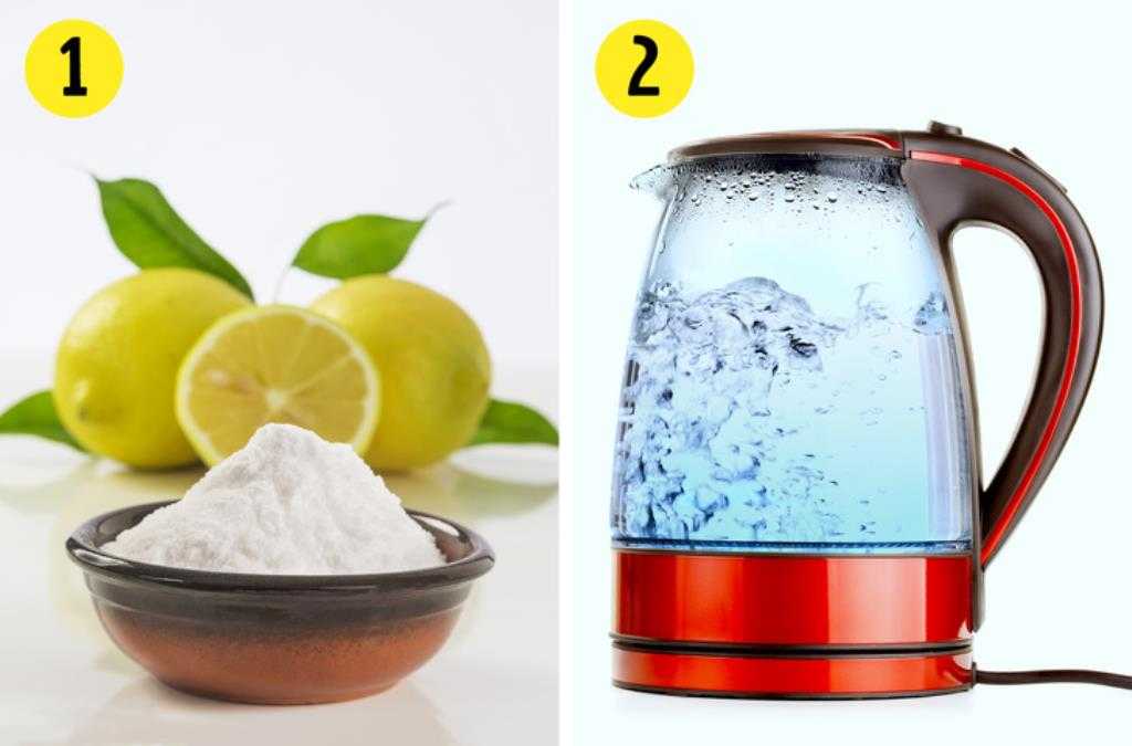 Кроме уксуса, поможет очистить накипь из тяжелых микроэлементов лимон. Для приготовления агрессивного состава цитрус разрезается пополам, помещается внутрь, чайник наполняется водой, кипятится 10–20 мин. Отслоившийся налет удаляется губкой, стенки вымываются.
