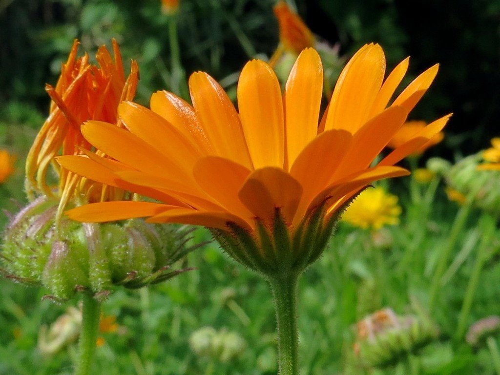 Календула – однолетник со стержневым корнем, прямостоячим и ветвистым стеблем. Это теплолюбивое, неприхотливое растение, достигающее 75 см в высоту. Листья слегка опушенные, продолговатой формы. Характерной особенностью календулы, отличающей ее от других лекарственных растений, является оранжевый или ярко-желтый окрас лепестков цветов, чашечки которых достигают 4 см в диаметре.