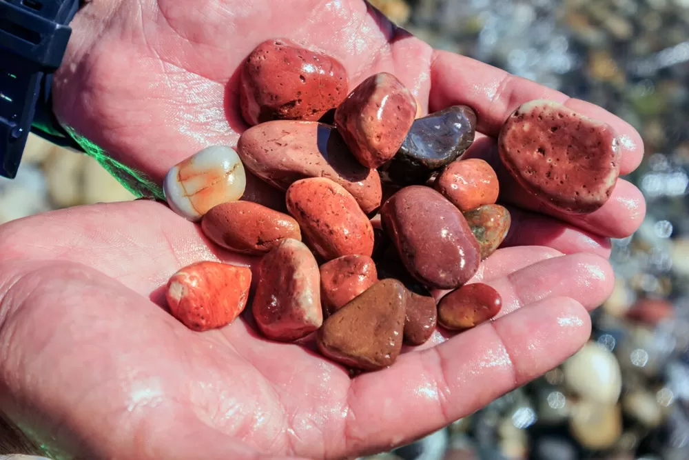 Алтайские камни черных или светлых оттенков с большими кристаллами кварца, сибирская ленточная яшма, минерал тона морских водорослей с розовыми точками дополняют саму природу. Цветные яшмы Богемии (исторический регион Чехии) похожи на нарисованные картины.