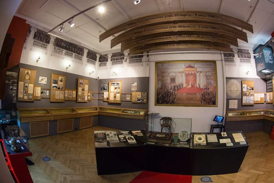 Экспозиция посвящена переломным событиям отечественной истории XIX-XX веков: отмене крепостного права, зарождению парламентаризма в СПб, развитию рабочего, революционного движений. На конституционной арене прославлялись имена Витте, Столыпин, тайная полиция придерживалась авторитарного режима, в газетных заметках, публичных «кружках» вершились судьбы страны.
