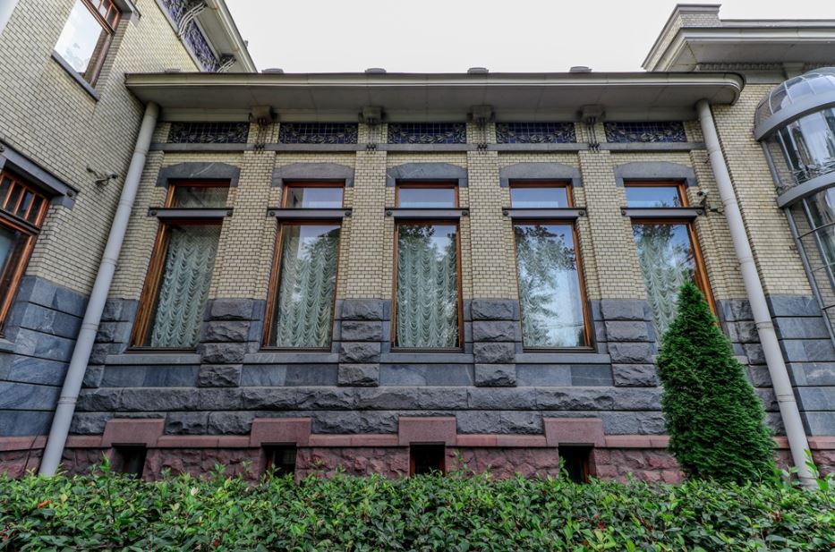 Цокольной отделкой послужил красный валаамский гранит «скальной» фактуры. Яркая облицовка отделена от основного массива широкой линией серого гранита. Далее — светлый зигерсдорфский кирпич, придающий изысканной легкости фасаду. Чернильные керамические фризы украшены металлическими узорами. Декоративные детали в сочетании с колпаками дымоходов положили начало культуре «хай-тэк».