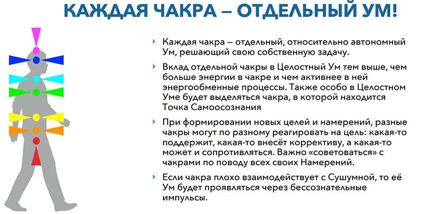 Реализация задачи чакры становится возможна, потому что каждая чакра обладает своим обособленным, достаточно автономным умом. Мы говорим так в некотором смысле аллегорично, но это полностью отражает суть данных процессов.