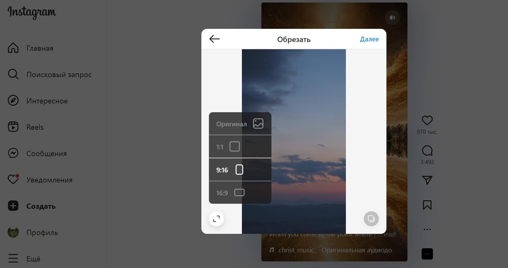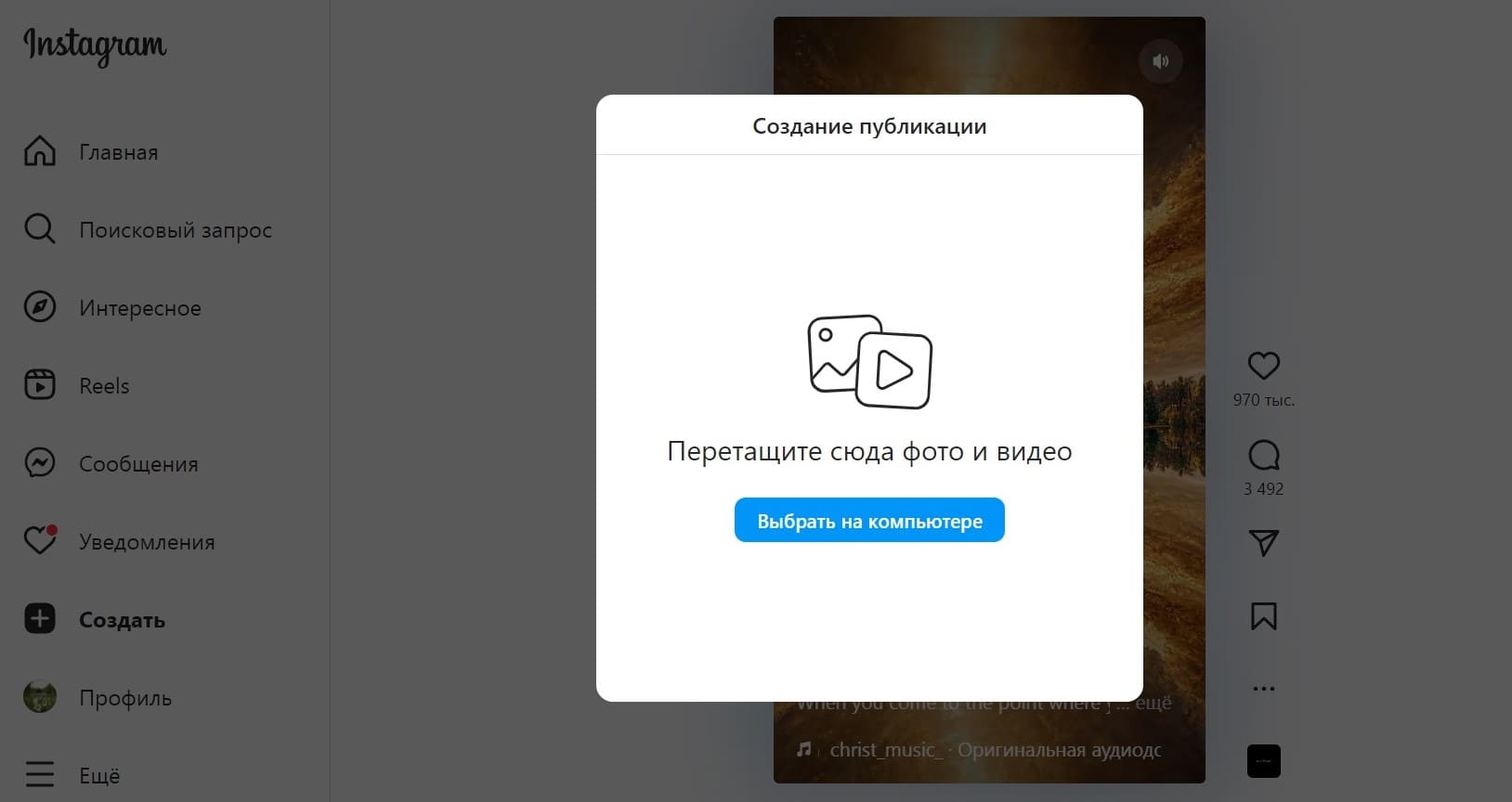 Работая в Инстаграм на компьютере через браузер, можно также загрузить видео формата Рилс. Для этого необходимо: