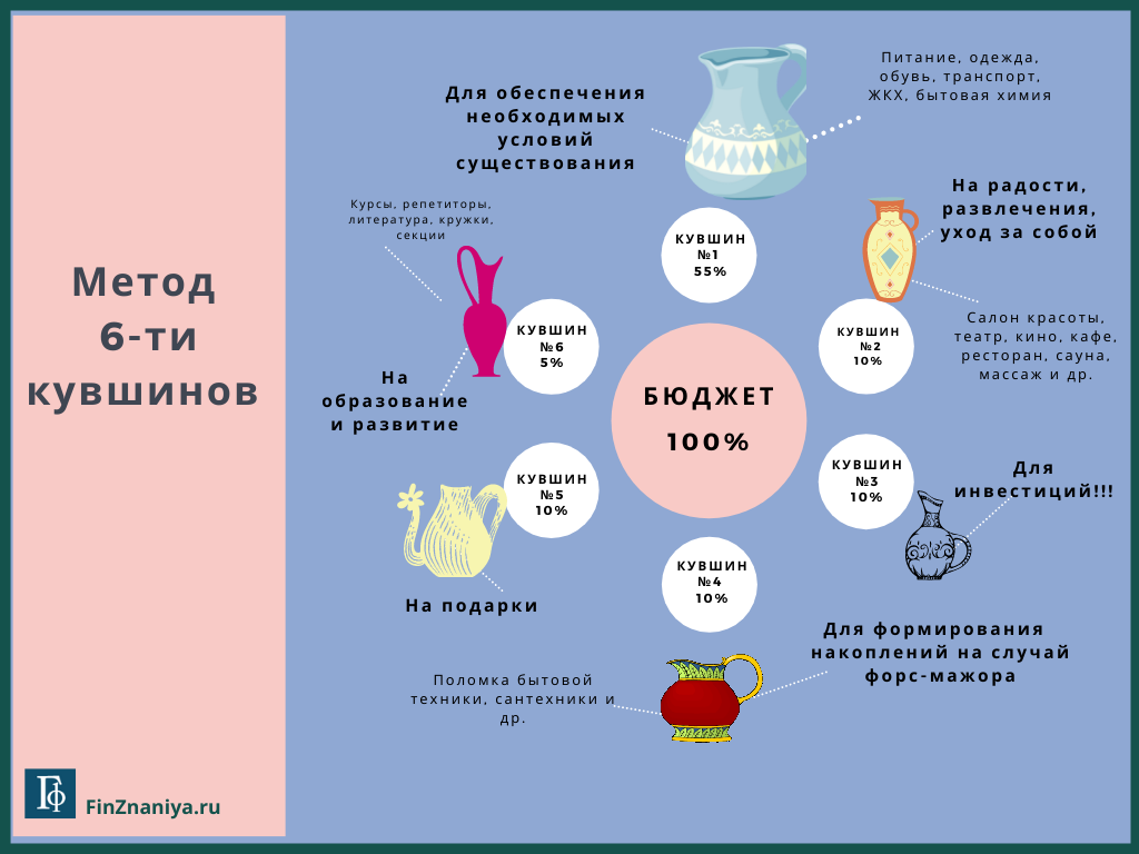 Все что нужно для данного метода – это пропорционально распределить доход на 6 частей-кувшинов (образно). Каждая из 6-ти частей отличается приоритетностью и категорией затрат.