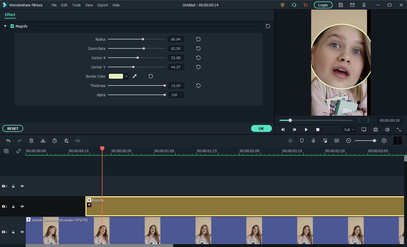Теперь дважды щелкните эффект на временной шкале и откройте свойства эффекта увеличения. В разделе «Свойства» вы можете настроить размер пузырька, используя такие функции, как «Радиус», «Центр Y», «Центр X», «Альфа», «Коэффициент масштабирования» и т. Д., Чтобы получить лучшее видео с эффектами большой головы.