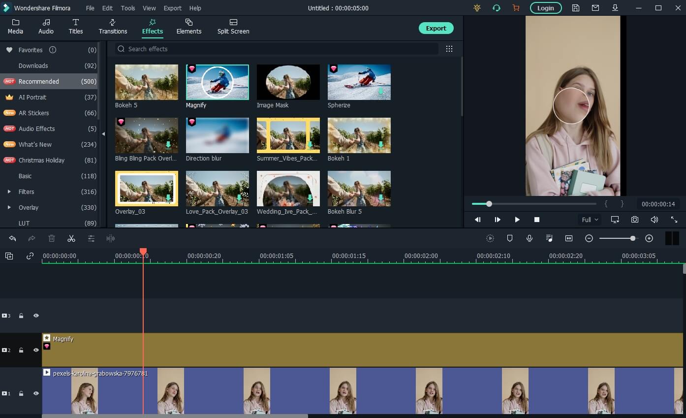 Во вкладке «Эффекты» перейдите к Рекомендованные категории, и тогда вы увидите эффект увеличения. Перетащите его на временную шкалу над видеодорожкой, и вы увидите, что часть видео была соответственно увеличена.