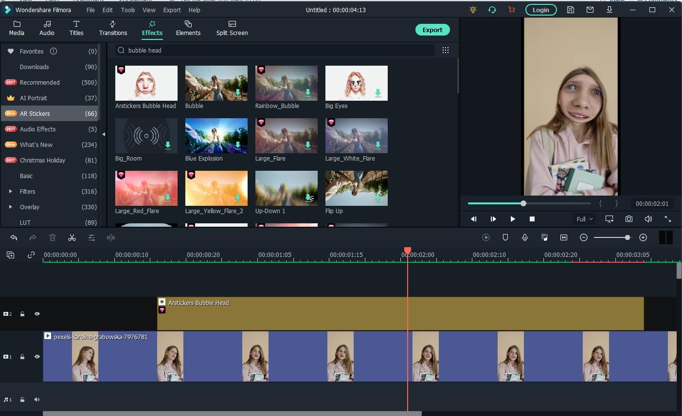 Чтобы добавить эффект «Большая голова» в FilmoraTool, щелкните параметр «Эффекты» и выберите Наклейки AR вариант. Введите пузырчатую голову в строке поиска, и вы увидите ее на экране. Затем перетащите Пузырь со стикерами дополненной реальности Руководитель влияние на временную шкалу, конкретно к той части видео, где вы хотите добавить фильтр «Большая голова» к человеку. Когда вы это сделаете, вы увидите пузырь на видео.