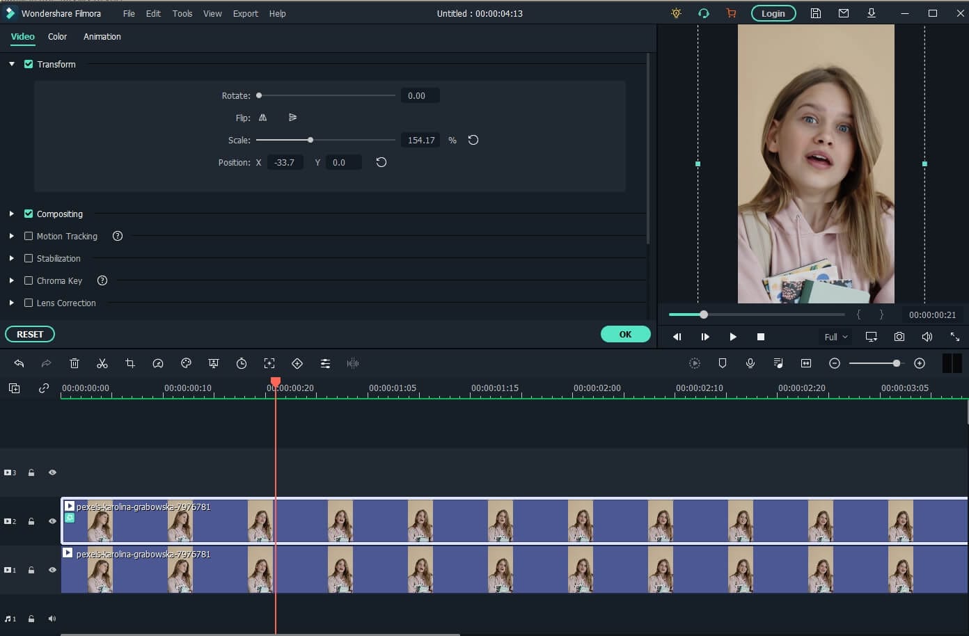 Затем снова щелкните видео на дорожке 2, а затем перейдите к Преобразование вкладку, используйте Шкала ползунок, чтобы настроить размер видео, чтобы сделать эффект большой головы.