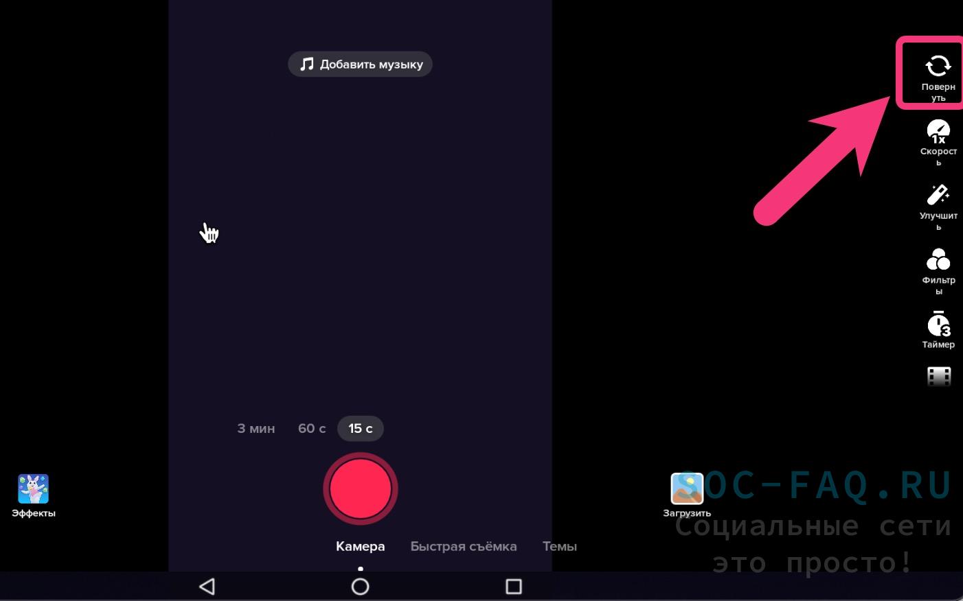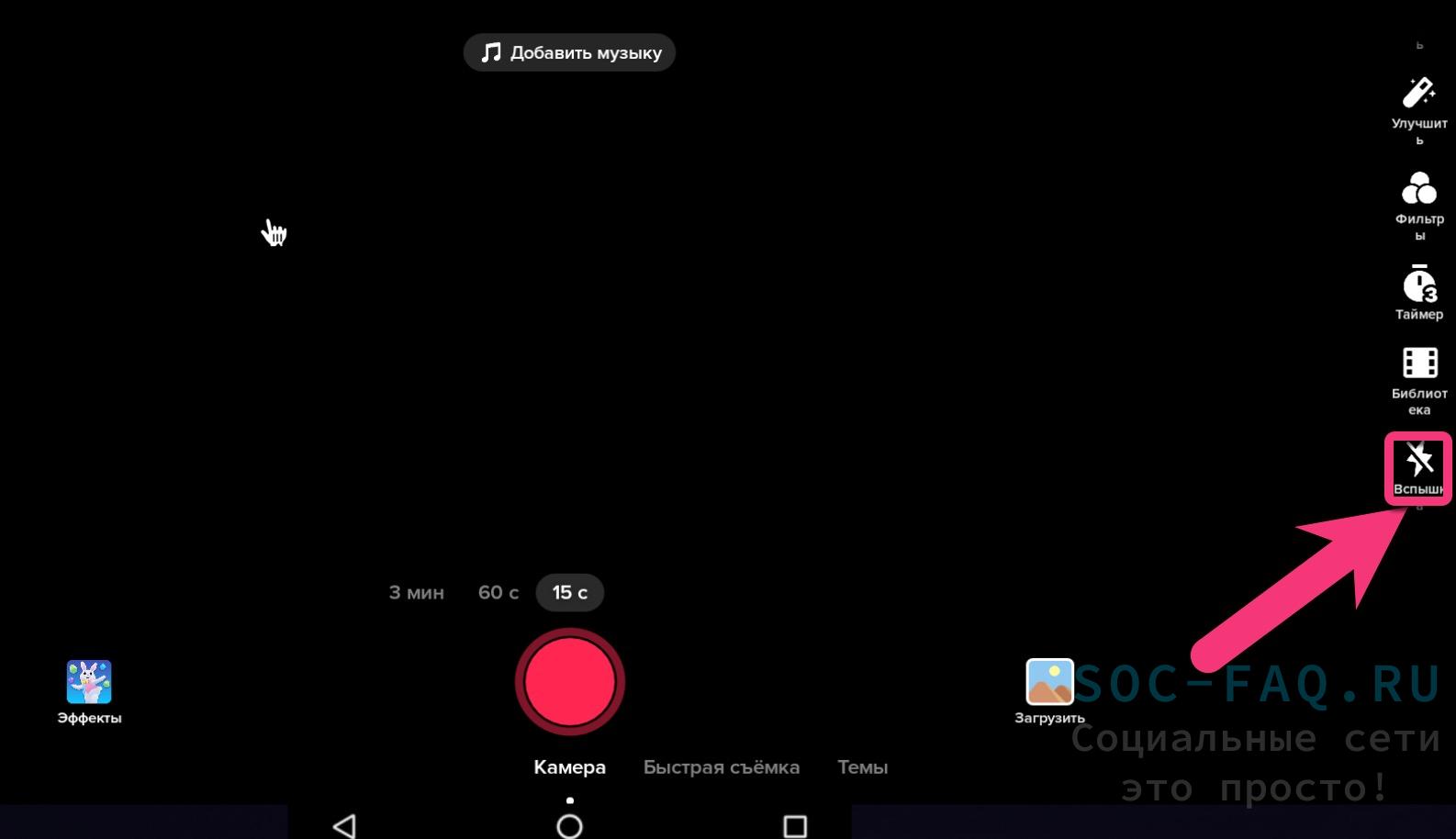 - Кликнуть по надписи «Эффекты» с левой стороны от большой круглой кнопки «Камера» красного цвета.