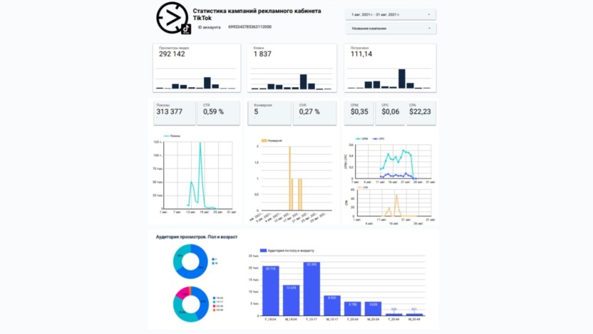 Чем полезен: дашборд с полной информацией о запущенной или прошедшей рекламной кампании в ТикТоке.