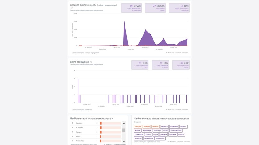 Сервис позволяет не только посмотреть общую статистику другого аккаунта в ТикТоке, но и оценить вовлеченность, периодичность постинга, используемые хештеги и даже наиболее популярные слова в заголовках. Данные можно сохранить в формате PDF-отчета.
