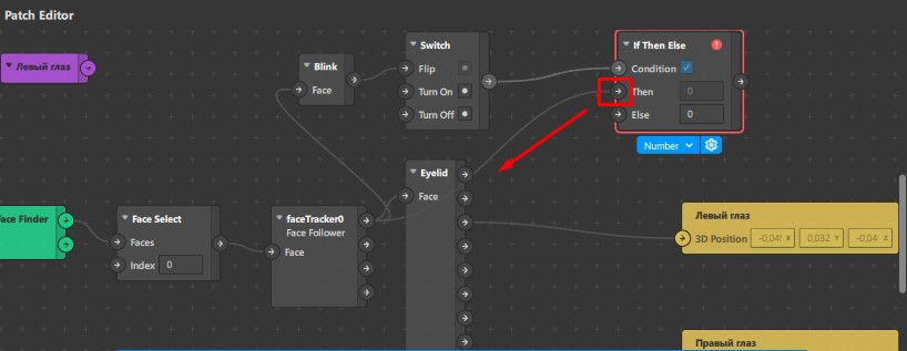 13. Теперь давайте сделаем так, чтобы звездочки вылетали не сплошным потоком, а по морганию глаз. Для этого на нижнем рабочем поле рисуем стрелочку от Face Tracker, и в поиске ищем If then Else, и нажимаем на кнопку Добавить Патч.