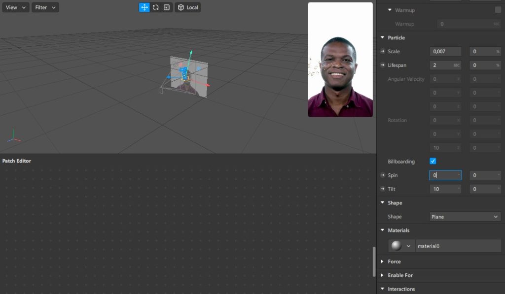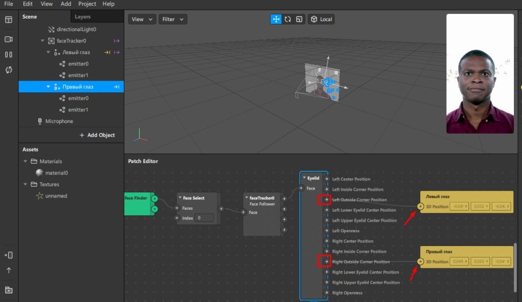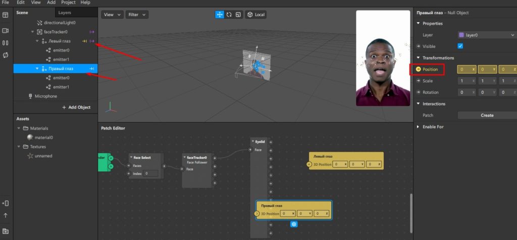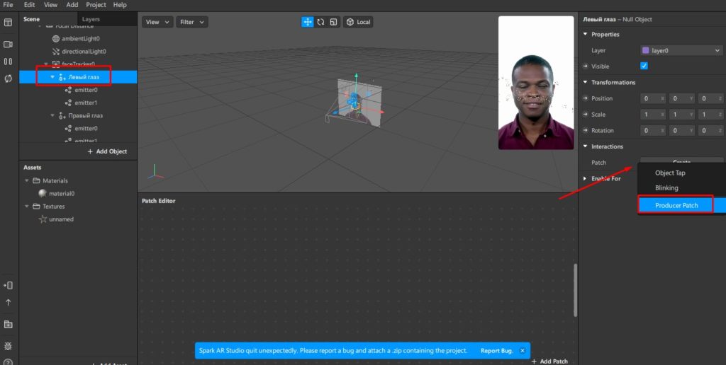 11. Чтобы объекты вылетали непосредственно из глаз, необходимо поработать с другими возможностями маски. Для этого выберите Левый глаз, в правой части экрана нажмите кнопку Create и выберите значение Producer Patch.