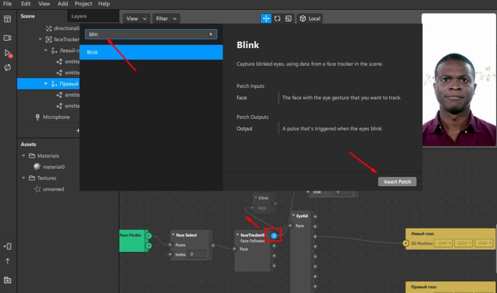 Добавим еще один патч — от Фейс Трекера ведем стрелочку и в поиске ищем патч Blink. Добавляем и его.