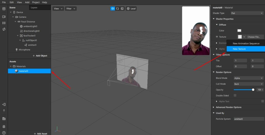 Далее в левой части экрана нажимаем на Материал. А в правой части экрана добавляем новую текстуру — ту самую звездочку в формате PNG, которую мы сохранили заранее, и нажимаем кнопку Open.