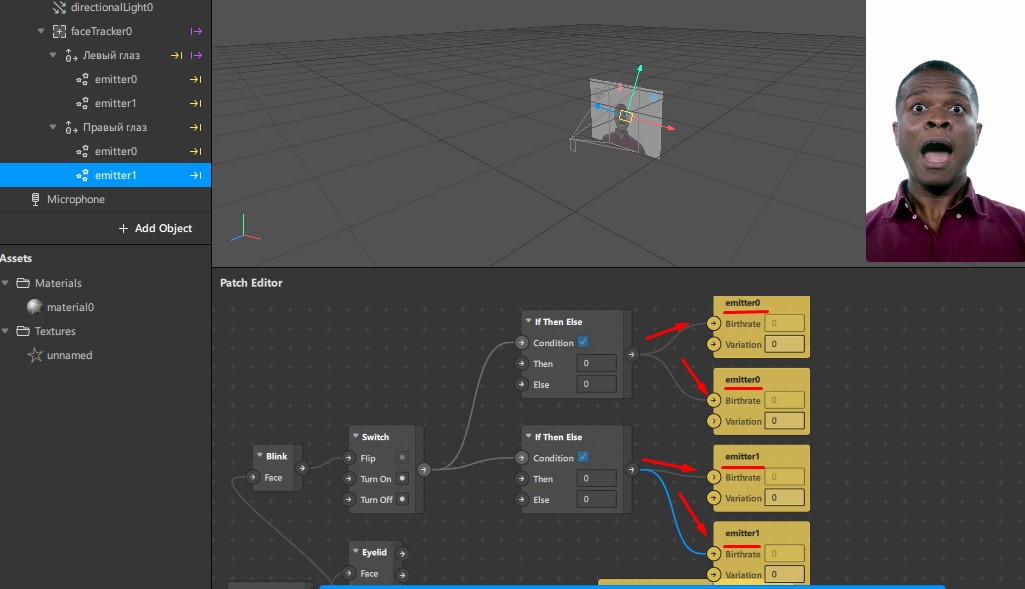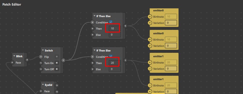 Сейчас нам нужно будет создать еще несколько блоков для Emitter 0 и Emitter 1 левого глаза и правого глаза, то есть еще 4 блока с параметром Birthrate. Для этого нажмите в левом рабочем поле Emitter 0 левого глаза, а в правом рабочем поле стрелочку возле Birthrate. Перетащите блок к верхнему блоку If then else. То же самое сделайте и для Emitter 0 правого глаза. Обе рамочки присоедините к верхнему блоку If Then else, проведя от него стрелочки к каждому из них.