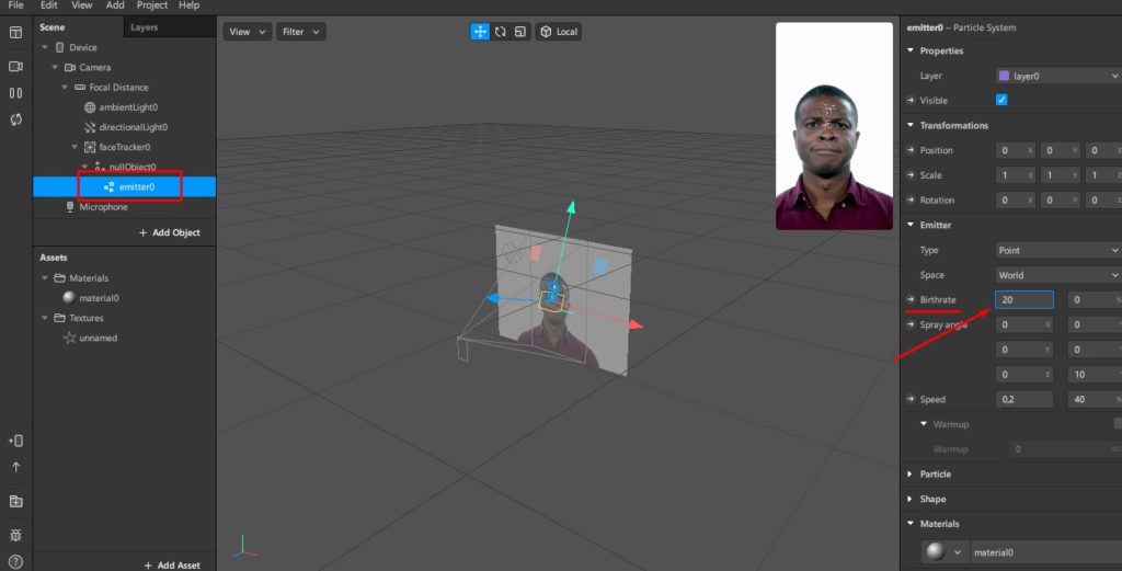 6. Чтобы изменить количество вылетающих звездочек, снова нажмите на Emitter в левой части экрана. А в правой части найдите окошко Birthrate. Тут по умолчанию стоит количество 20. Вы можете его увеличивать и уменьшать, в зависимости от вашей задумки. Если вы поставите значение 1, то будет вылетать 1 звездочка, если 100, то они будут литься фонтаном.