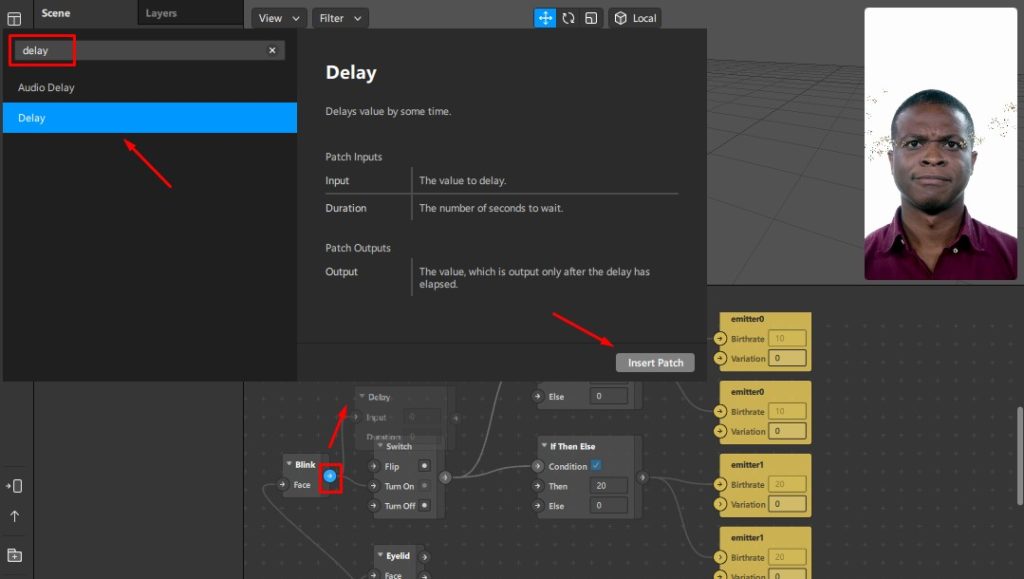 Далее снова от блока Blink тянем стрелочку вверх. В окне поиска патчей вводим слово Delay (задержка) и нажимаем добавить патч.