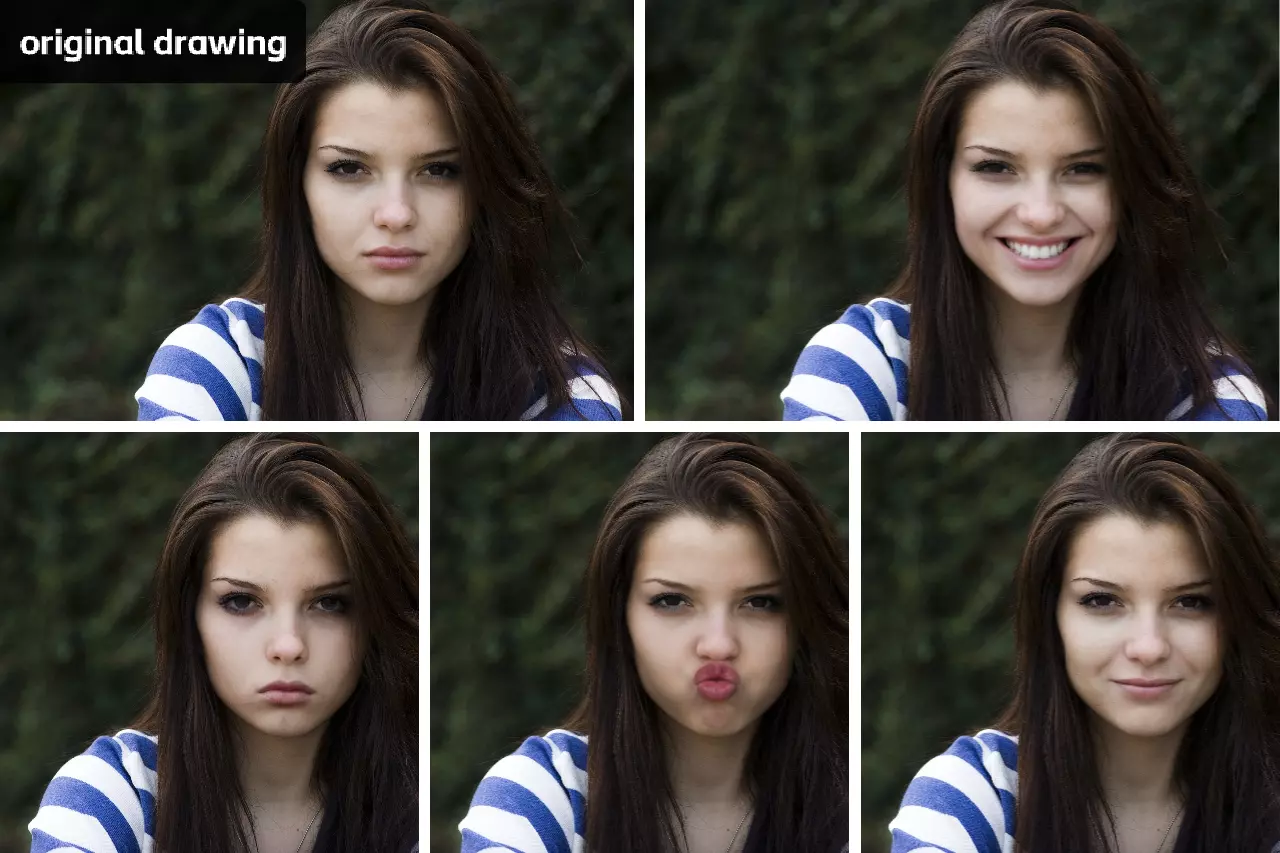 С помощью передовых методов обработки изображений редактируются выражения лиц на снимках, включая смех, надутость, расстройство и улыбку.