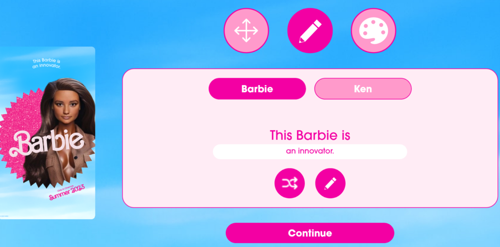 Кнопка “Карандаш” открывает меню редактирования верхней надписи. Автоматические варианты чаще отвечают на вопрос “Кто эта Барби (Кен)?” В варианте ниже нейросеть называет куклу новатором . К примеру, можно написать “is… the best” – “самая лучшая” (Эта Барби – самая лучшая).