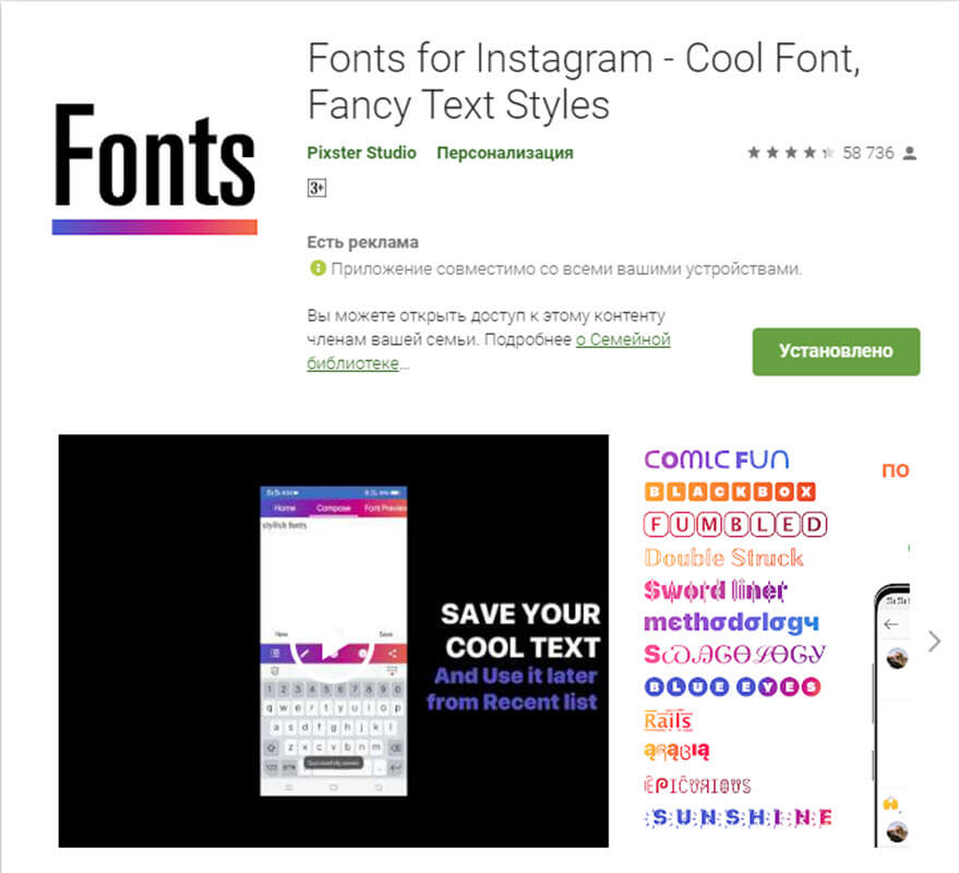 - Fonts — for Instagram. Простое приложение, где можно ввести текст в нужном шрифте, а также сразу скопировать его в нужный мессенджер, в том числе и Instagram.
