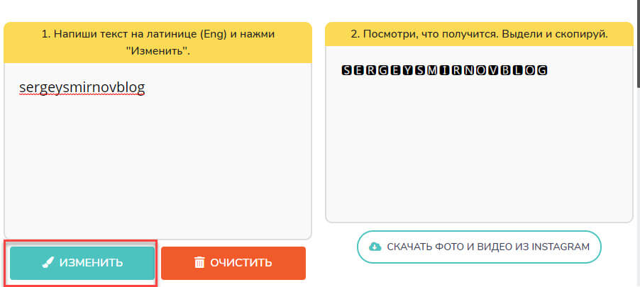 Предположим, что нам понравился вариант с текстом Black Square. Нажимаем по нему и ждем загрузки следующей страницы. Здесь в первое поле вводим наш исходный текст, а затем кликаем «Изменить». Сервис молниеносно обрабатывает запрос, и на выходе мы получаем не просто красивый, но и очень привлекательный текст.