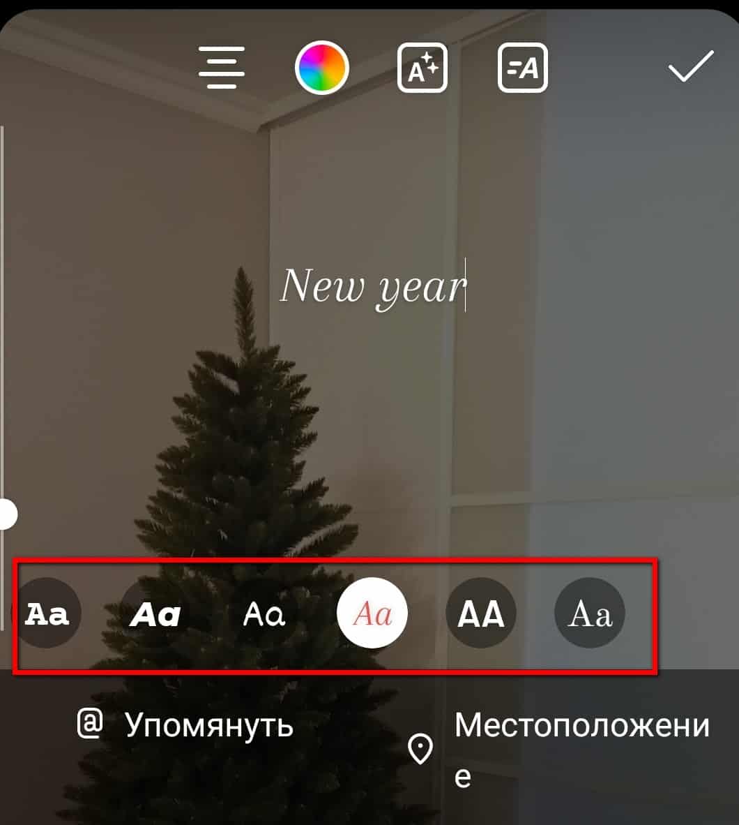 После того, как вы нажали на кнопку «Текст», возможно, вы увидите меню со стандартными шрифтами, которые предоставляет Instagram. Если же вы хотите использовать другие шрифты, вы можете нажать на кнопку «Aa» в этом же меню. Затем можно выбрать шрифт из готового набора, или загрузить свой.