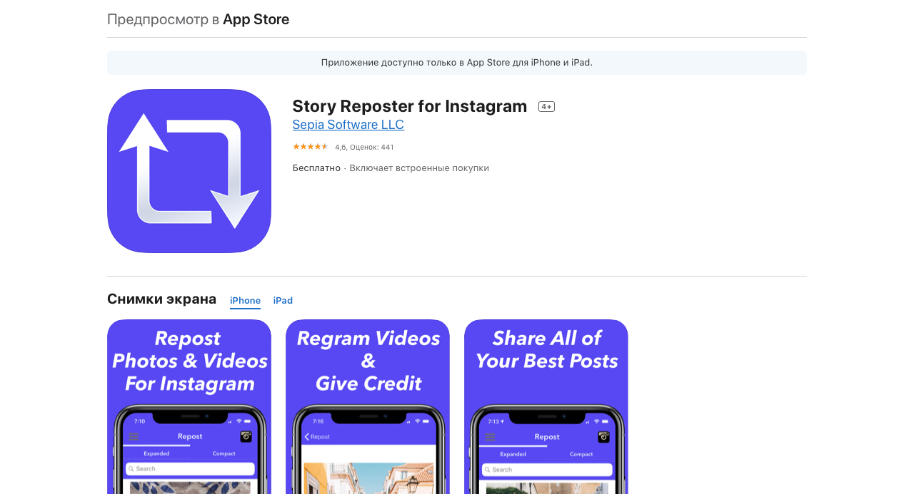 Если вы используете устройство, работающее на платформе iOS, то данное приложение – единственный выход для вас. С его помощью вы сможете просматривать, скачивать и репостить чужие «истории». При этом нет необходимости регистрироваться или входить в аккаунт. Ключевым недостатком является то, что это приложение не русифицировано.