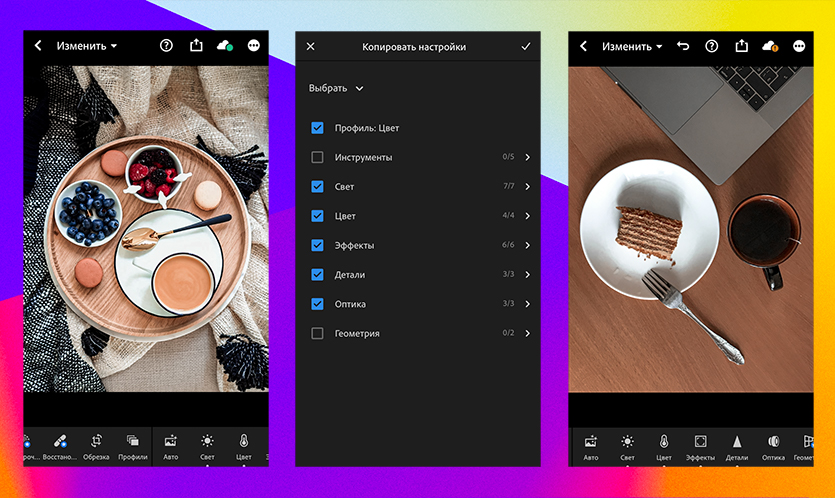 Здесь вам нужно выбрать подходядящий набор настроек, скопировать их и перебросить на ваш снимок.