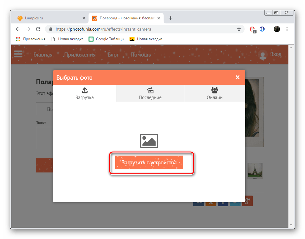 Для выбора снимка, хранящегося на компьютере, нажмите на кнопку «Загрузить с устройства».