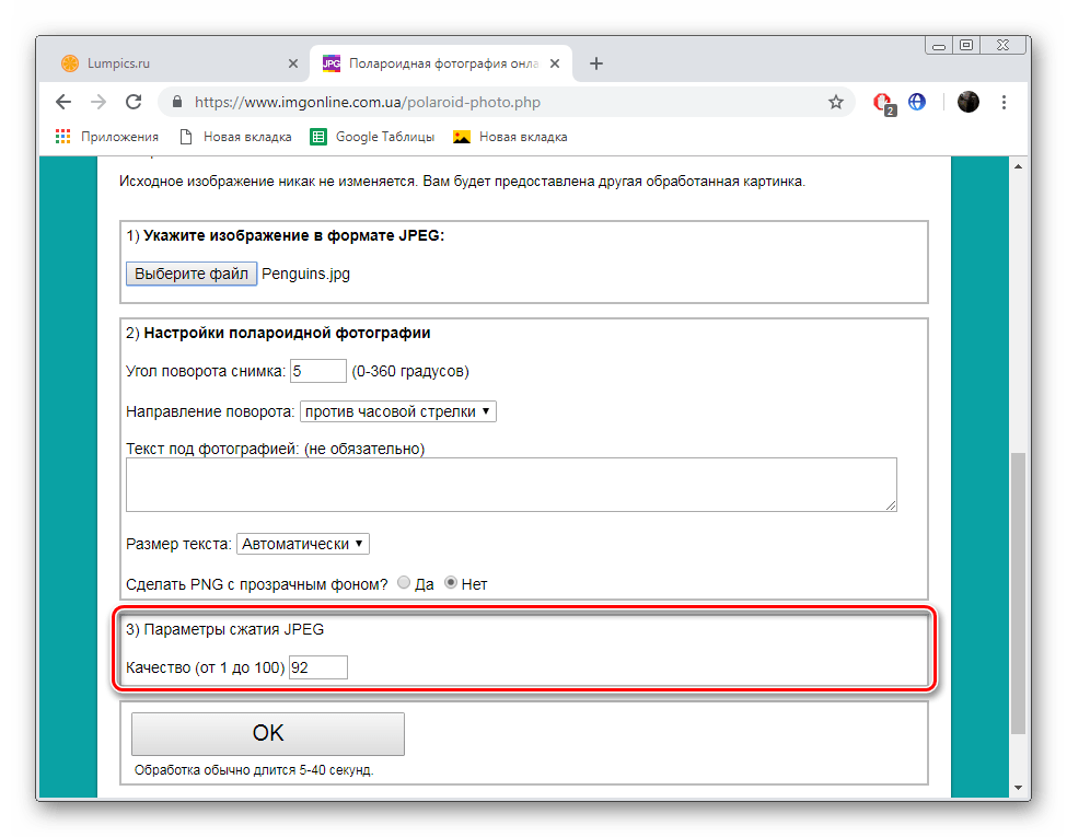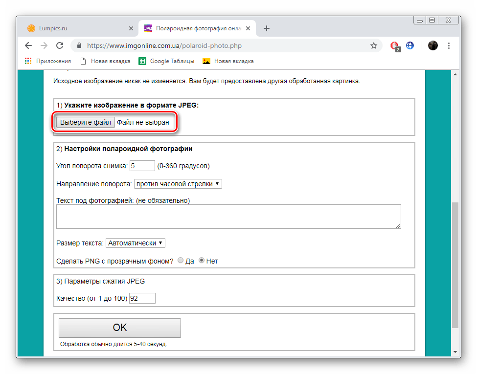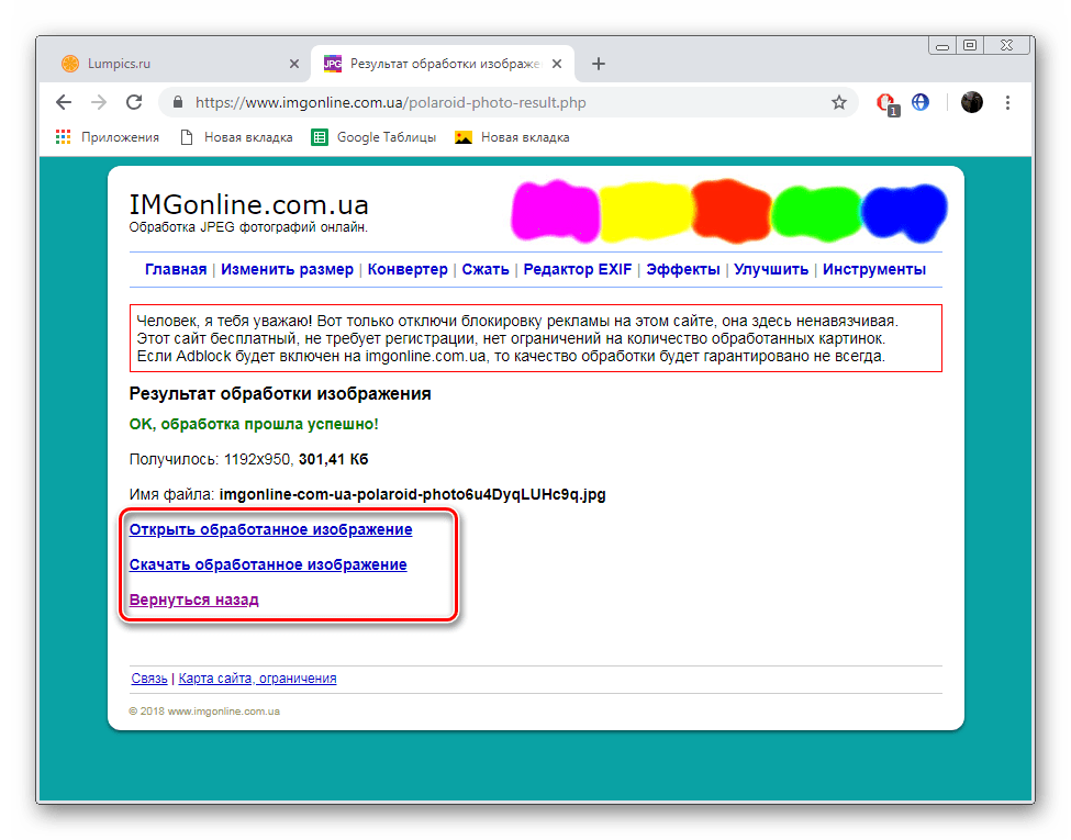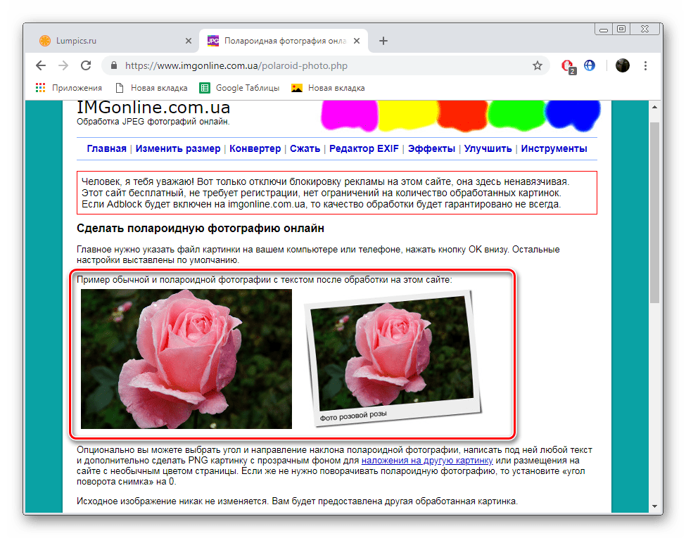 Интерфейс интернет-ресурса IMGonline выполнен в устаревшем стиле. Здесь нет привычных кнопок, как во многих редакторах, а каждый инструмент нужно открывать в отдельной вкладке и загружать для него картинку. Однако справляется с поставленной задачей он прекрасно, касается это и применения обработки в стиле Полароид.
