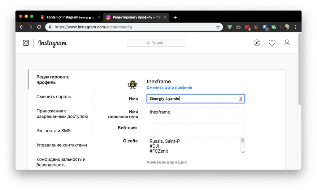 Если вы пользуетесь web-версией Инстаграма, следующие советы помогут вам изменить шрифт в шапке профиля: