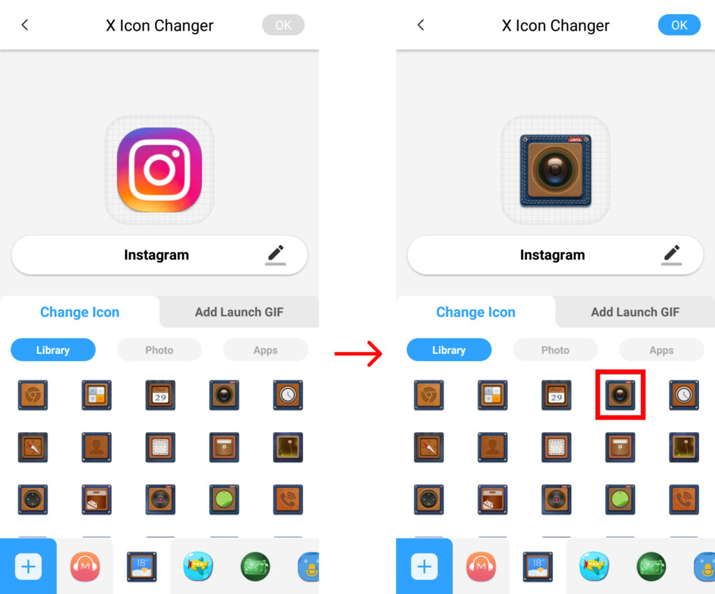 - Выберите нужный значок приложения Instagram из списка или пакетов значков, установленных в приложении Smart Launcher. Теперь старая иконка заменена новой.