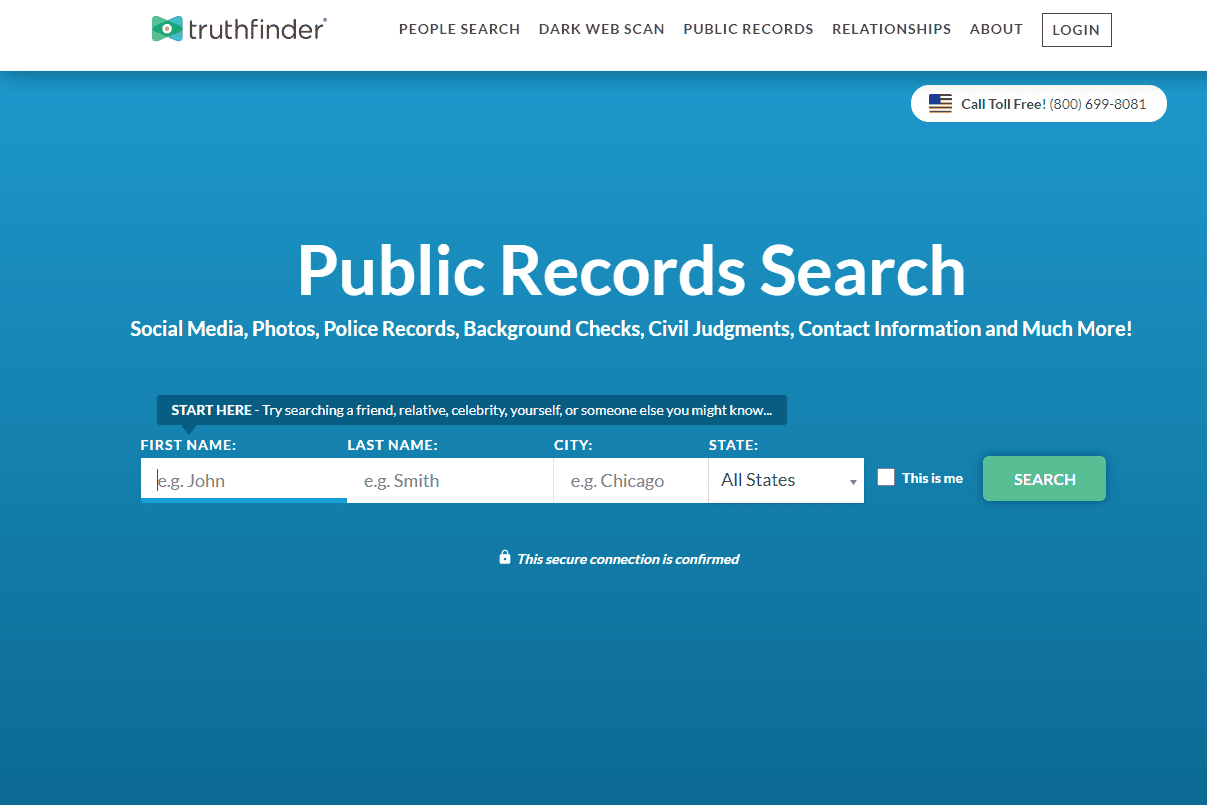 Веб-сайт поиска людей TruthFinder начинается с поиска всех следующих данных о человеке: правонарушения, правонарушения, судебные записи, судебные решения, уголовные преступления, банкротства, родственники, номера телефонов, онлайн-профили, активы, записи об арестах, разрешения на оружие, фотографии, сексуальные преступления и адресная информация.