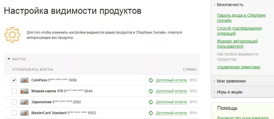 - В настройках видимости кликнуть на вкладку Сбербанк Онлайн, чтобы увидеть только те продукты, управление которыми доступно через сервис.