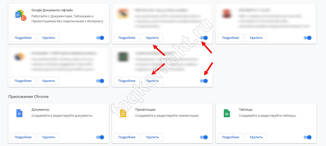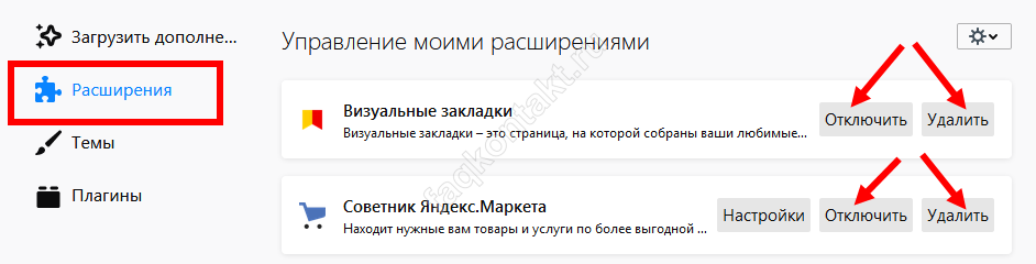 - перед Вами откроется список активных расширений на Вашем устройстве. Деактивируйте и удалите поочередно расширения, постоянно проверяя пропали или нет блоки рекламы на Вашей странице.