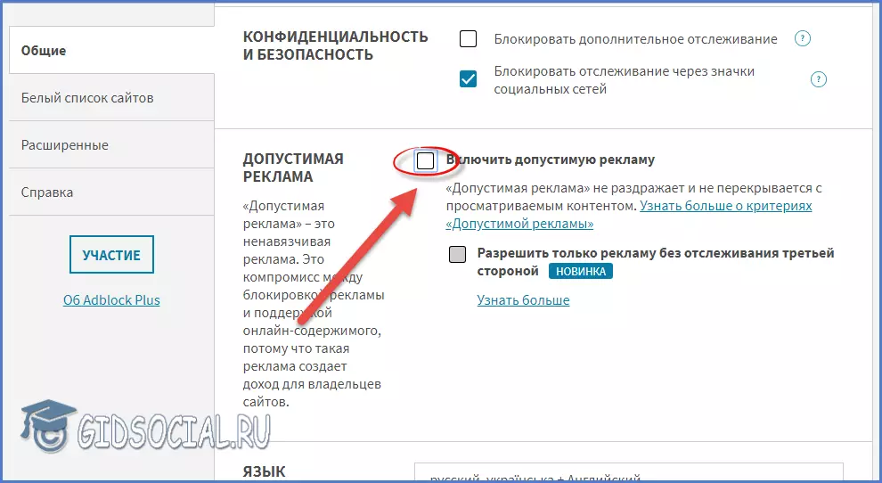- Во вкладке «Общие» нужно найти раздел «Допустимая реклама» и снять галочку в пункте «Включить допустимую рекламу».