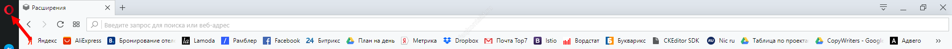 Для этой этого браузера инструкция мало отличается от предыдущей. Разве что в названии блоков меню. Поэтому щелкайте на меню и выбирайте раздел «Расширения» (Ctrl+Shift+E).