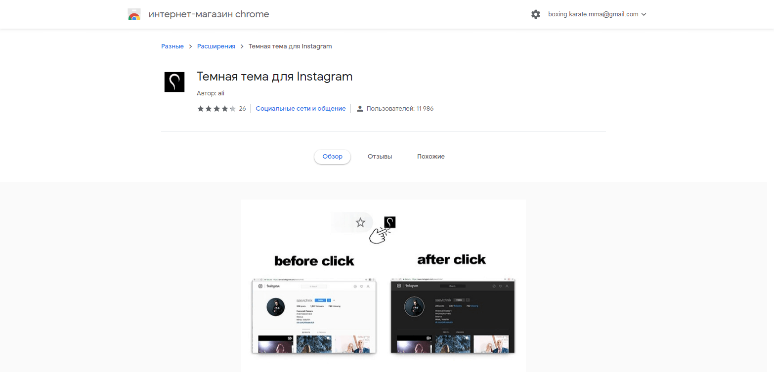 Чтобы режим Инстаграмма в браузере стал темным, нужно скачать расширение. Google Маркет предоставляет множество плагинов на выбор. Наиболее удобные среди них – это Темная тема для Instagram и Night Mode for Instagram. Программы работают с фотохостингом, меняя фон и текст на вкладках.