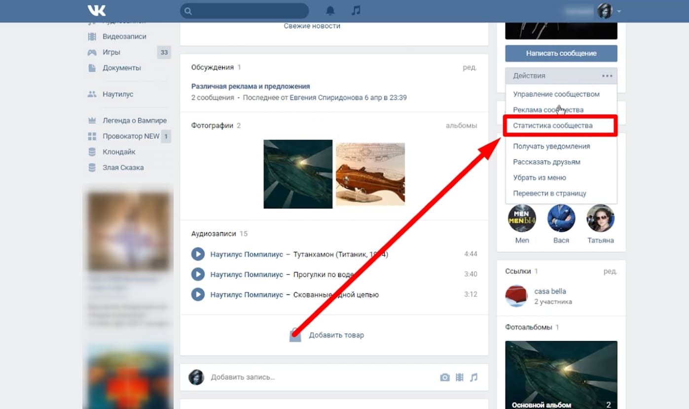 - Кликнуть на «Статистика сообщества» в правом столбце управления.