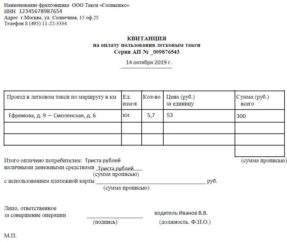 Бывают случаи, когда ККТ в такси нет, а подтверждение поездки нужно сейчас. Тогда попросите водителя заполнить БСО – Бланк строгой отчётности, который подтверждает перевод денег за услугу.