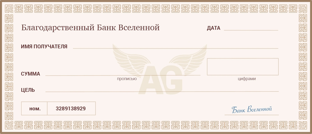 Чек представляет собой документ, в котором человек указывает свои данные и нужную для реализации желания сумму. Считается, что деньги исполнителю ритуала дает само мироздание. Эзотерики предлагают представить Вселенную в виде банка, который готов безвозмездно выдавать средства любому человеку.