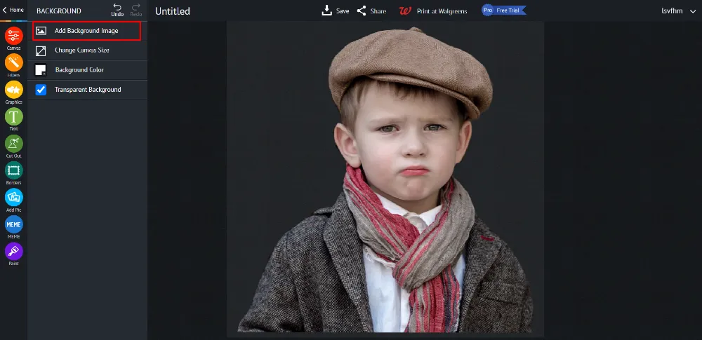 Затем масштабируйте вырезанный объект, нажмите на «Canvas» – Add Background Image».