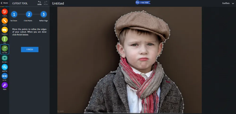Расставляя опорные точки по объекту, создайте выделение. Подтвердите окончание действий, нажав «Finish». При необходимости уточните границы, двигая «якоря».