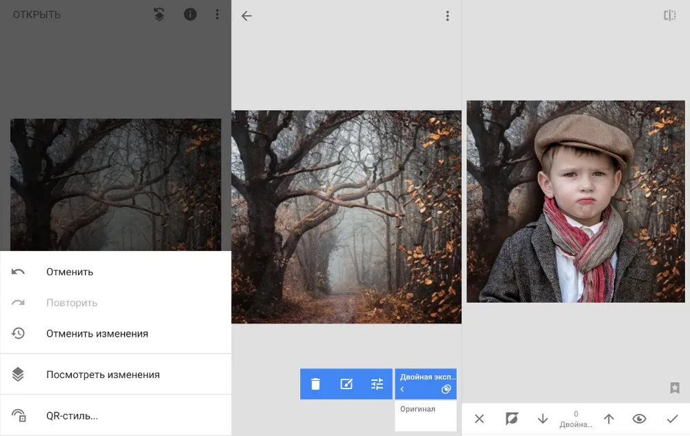 Много возни с протиранием контуров. Совмещение объектов по параметрам света, тени, оттенка невозможно. Неудивительно, ведь в приложении отсутствует прямая функция по замене фона. Поэтому Snapseed не могу рекомендовать конкретно для замены задника. Процедура проводится долго с сомнительным результатом, а сообразить, что для смены фона нужна «Двойная экспозиция», удастся не всем.