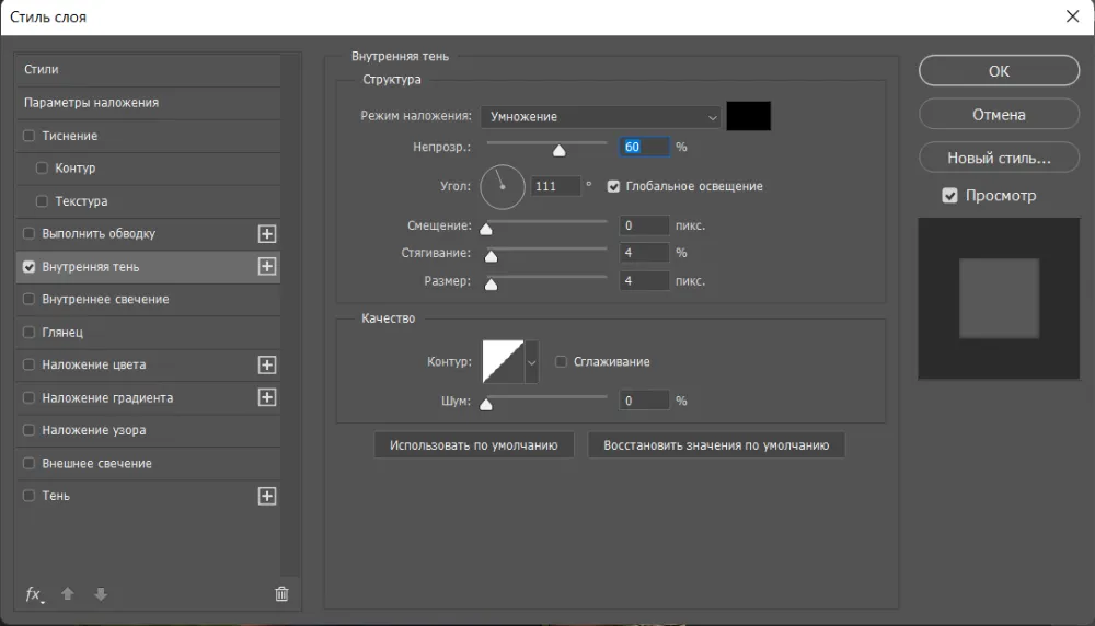 В правом нижнем углу экрана найдите иконку «fx» и выберите опцию «Внутренняя тень». Установите параметры как на скриншоте: