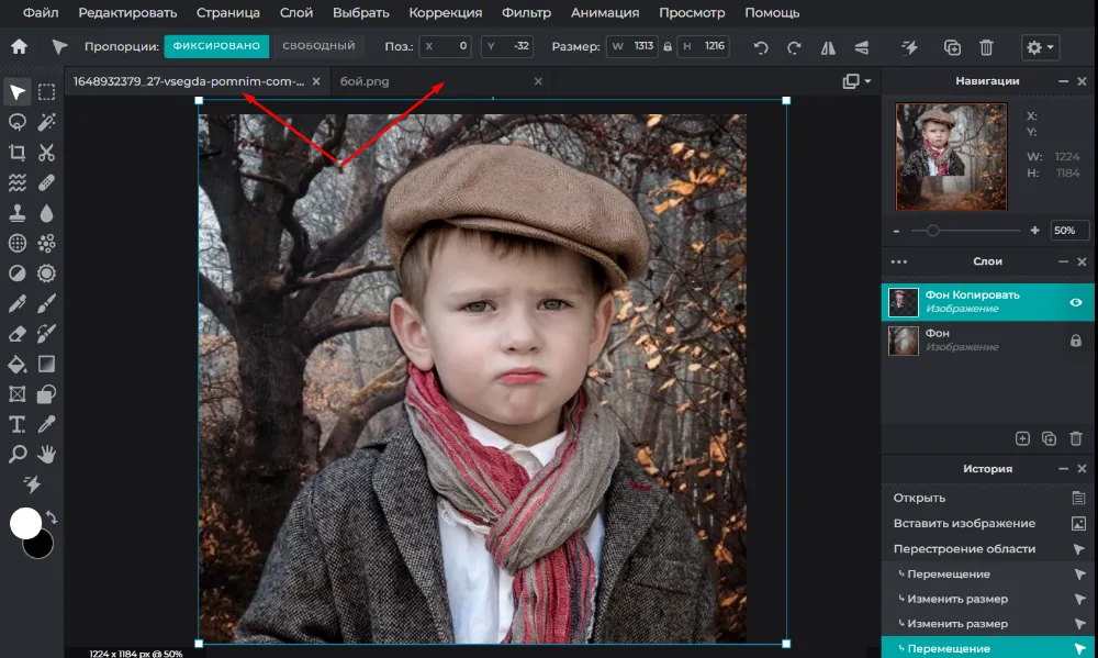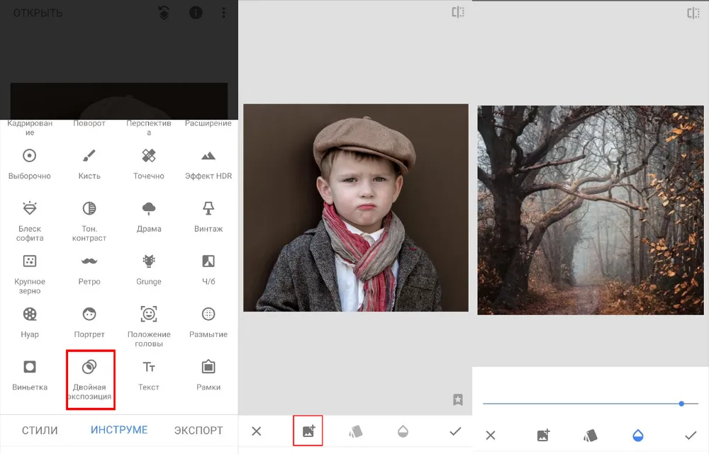 Загрузите в редактор фото, с которого нужно убрать фон. Выберите из раздела «Инструменты» опцию «Двойная экспозиция».